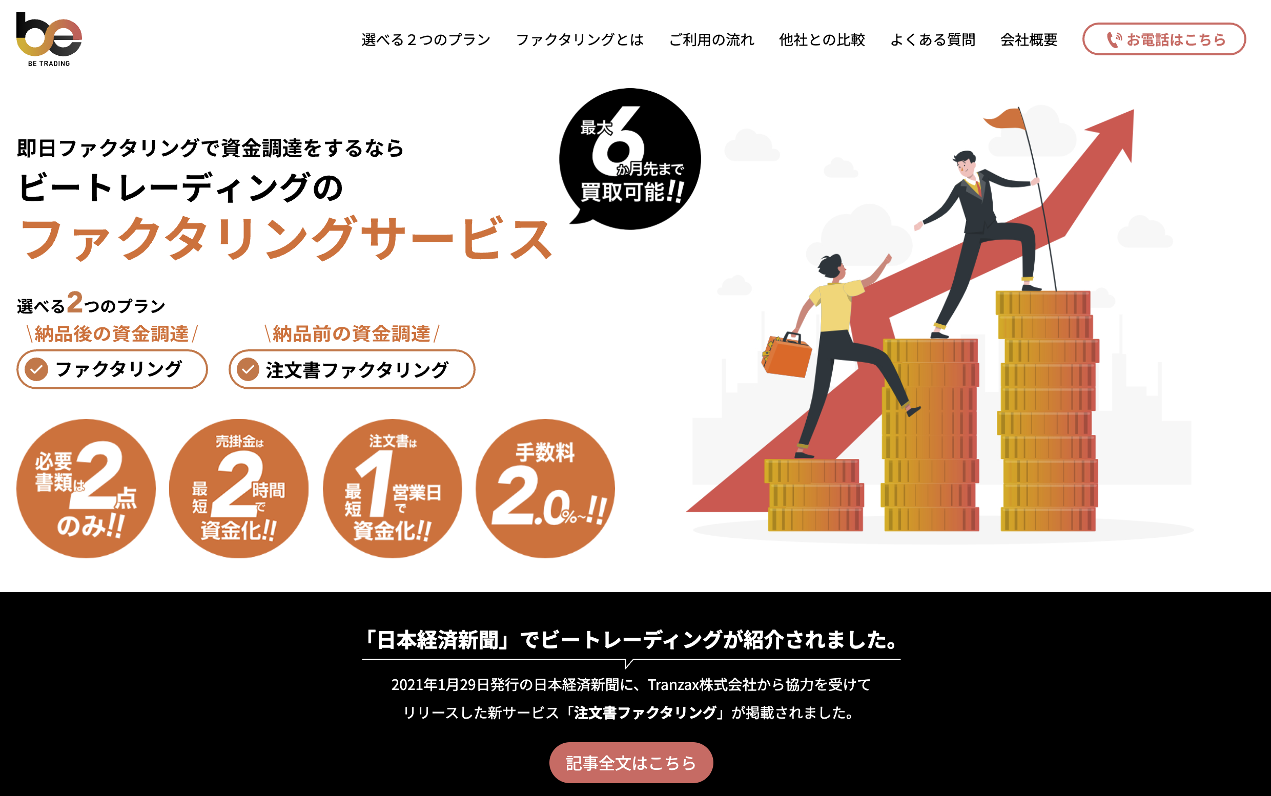 赤字決算・債務超過・開業1年未満といった状況でも相談可能で、ノンリコース契約なので未回収リスクに備えたい方にもおすすめです。