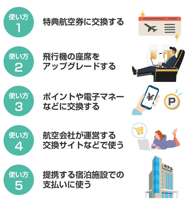 貯めたマイルは「特典航空券」との交換の他、飛行機の座席のアップグレード、ポイントや電子マネーへの交換など、さまざまな用途で活用できますよ。