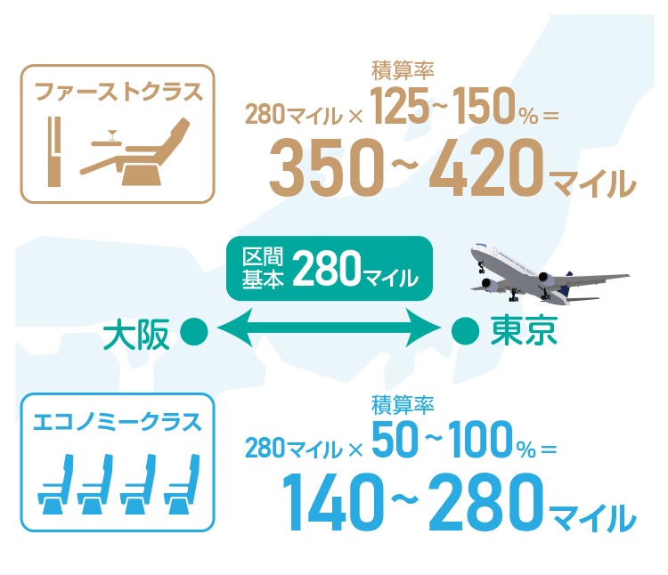 フライトマイルは「搭乗区間の基本マイル×運賃種別や予約クラスごとの積算率」で算出されます。