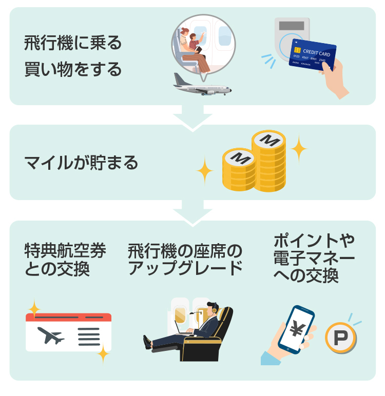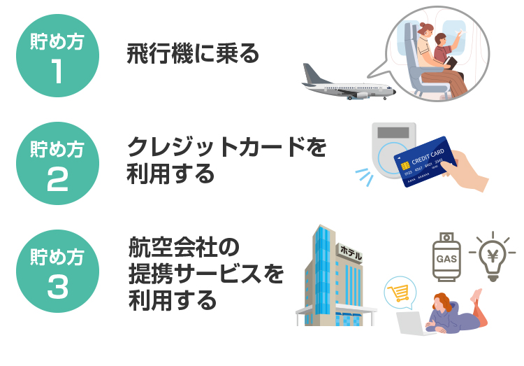 主なマイルの貯め方には「飛行機に乗る」「マイルが貯まるクレジットカードで買い物をする」などがあります。