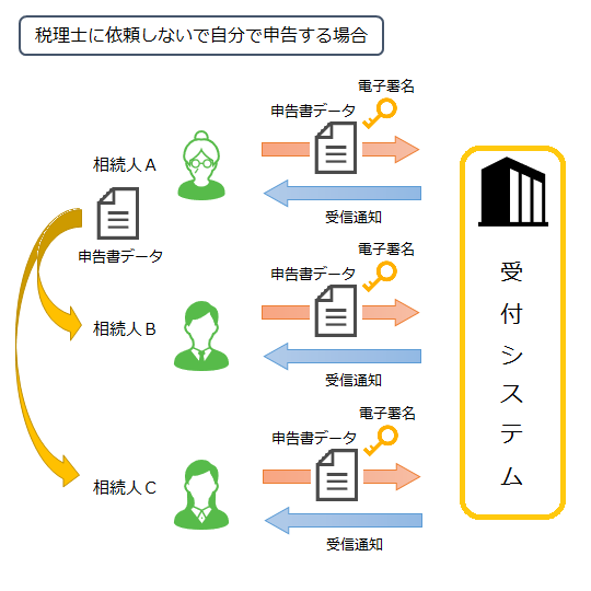 税理士に依頼しないで相続人が自分で申告する場合は、相続人がそれぞれ申告書データに電子署名(電子証明書)をつけて提出します。複数の相続人の申告書データをまとめて提出することはできません。