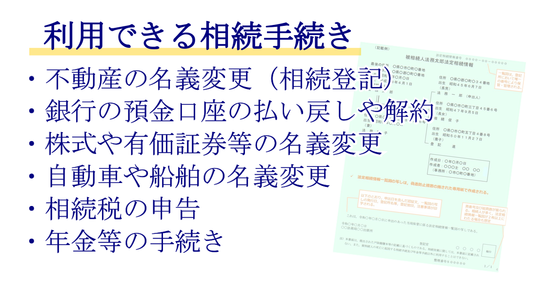 法定相続情報一覧図の写しだけで相続関係を公的に証明できるため、各種相続手続きにおいて戸籍謄本の提出が不要となります。