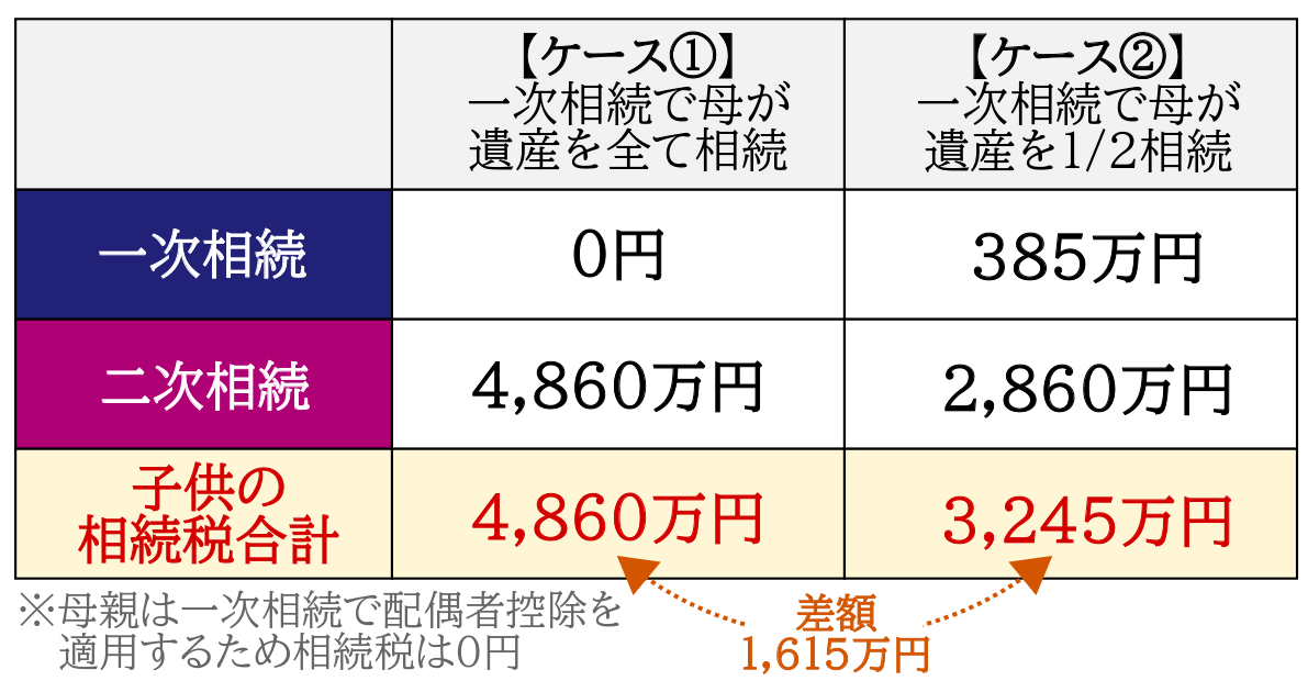 一次相続で「配偶者控除を使えば相続税がかからないから」と配偶者である母がすべての財産を取得することで、結果的に子供が1,615万円も多く相続税を納税しなければならないことが分かります。