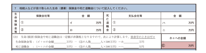 亡くなった人の遺産だけでなく、遺族が受け取った生命保険金、損害保険金や死亡退職金についても記載します(7)。保険金・死亡退職金は一定の範囲で非課税になるので、課税される部分の金額を計算します。