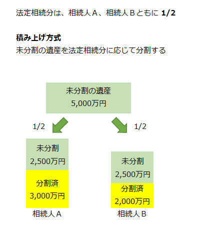 未分割の遺産だけを法定相続分で分割して分割済みの遺産に上乗せする考え方(積み上げ方式)もありますが、実務では上記の穴埋め方式が採用されています。