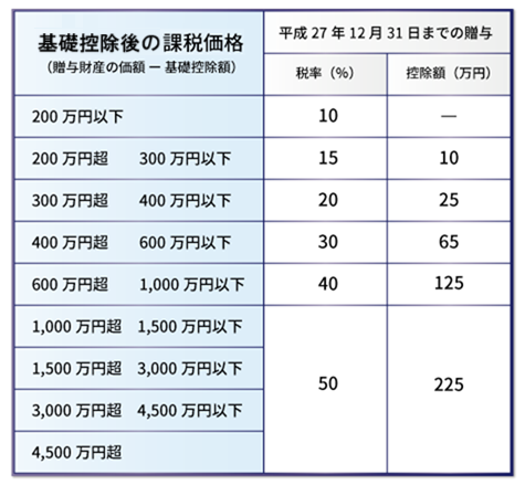 平成26年以前に行われた贈与については、“誰から誰に贈与するか”に関わらず、すべての贈与で一律の税率となっていました。なお、平成27年以降の改正で全体的に税率が引き下げられており、減税となっています。