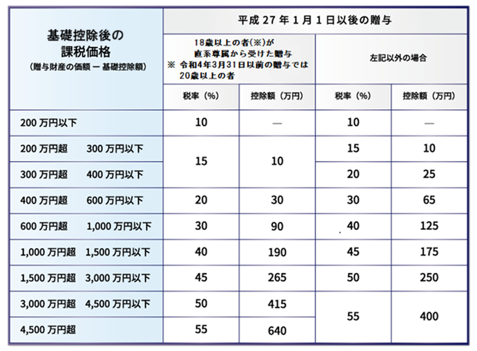 この特例贈与の場合の税率は上記表の左側(18歳以上の者が直系尊属から受けた贈与)を参照してください。