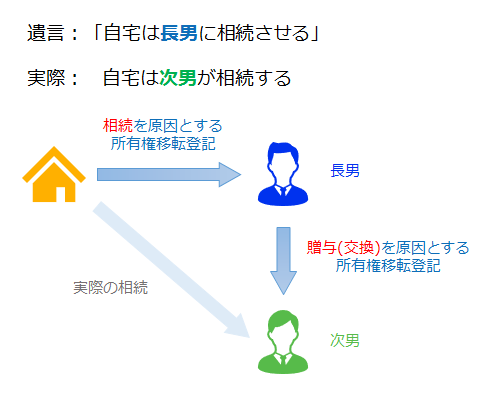 特定遺贈があってそれとは異なる遺産分割をした場合は、原則ではまず遺言に沿った相続登記を行った上で、次に贈与または交換による移転登記を行う必要があります。