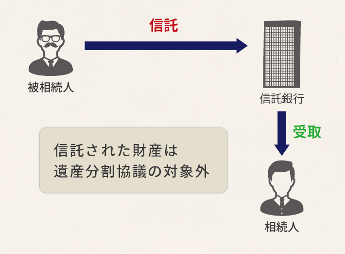 遺言代用信託は、被相続人が生前に財産を信託銀行に信託し、信託銀行から相続人に財産が払い出されるものです。信託した財産は遺産分割協議の対象にならないため、遺言書を作成しなくても特定の人に確実に遺産を引き継ぐことができます。